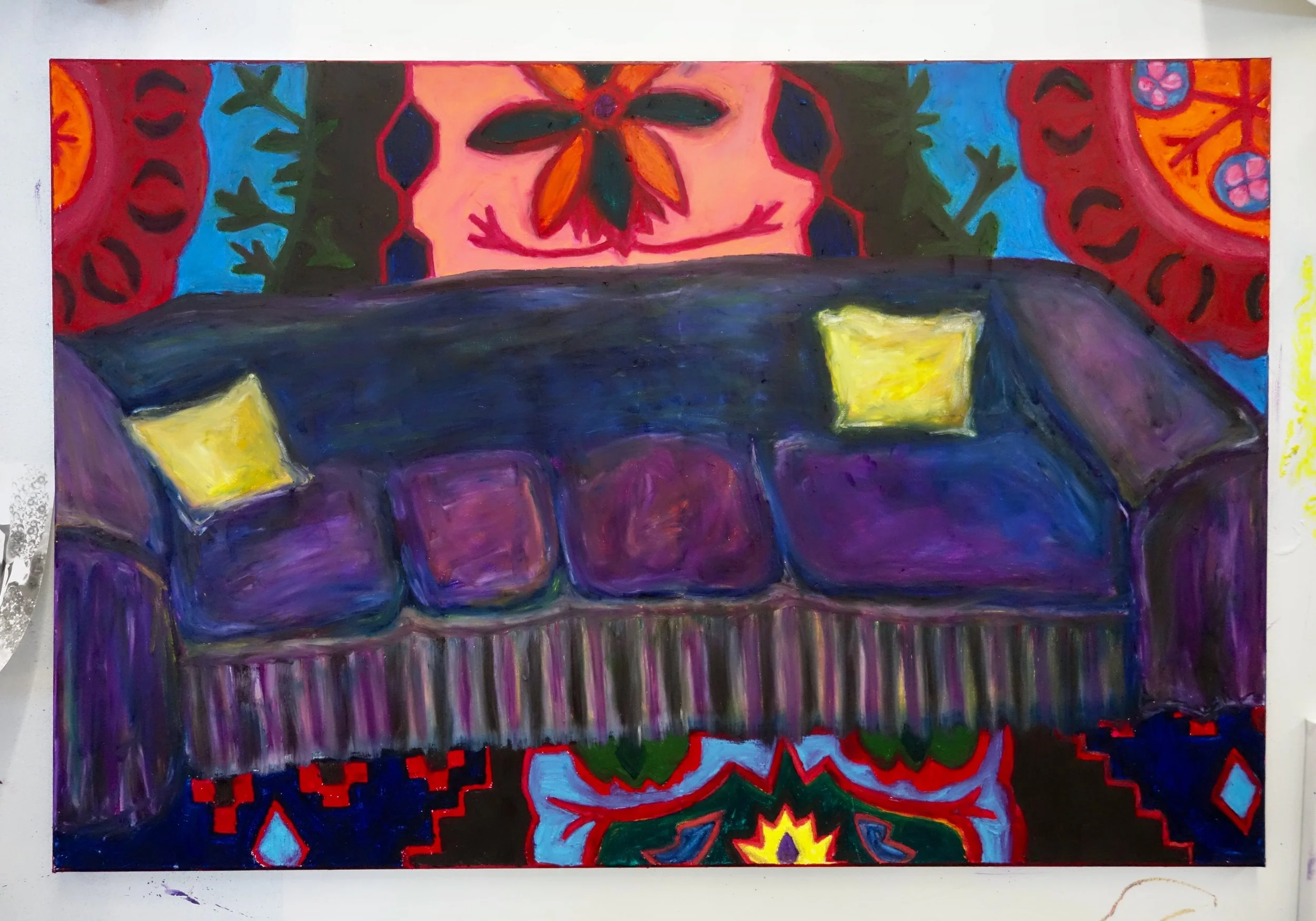 Growing up in an early 1900s home and spending much of her childhood in her grandmother’s richly decorated house, Grace developed a deep sensitivity to the atmospheres of lived-in spaces. These environments, filled with patterned fabrics, decorative wallpapers, and a carefully arranged, sometimes distorted perspective on furniture, allude to her loose memories of the rooms growing up and the dysfunction between the joy of a room and home and the contrasting tensions rooms can hold. Furniture became her earliest lessons in how rooms can hold warmth, tension, happiness, or melancholy. Rooms do not lose this ability even when unoccupied for extended periods. This sensitivity contributes to shaping and grounding her work intuitively and reflectively, where she draws on concrete and more loosely filled memories to create her paintings.